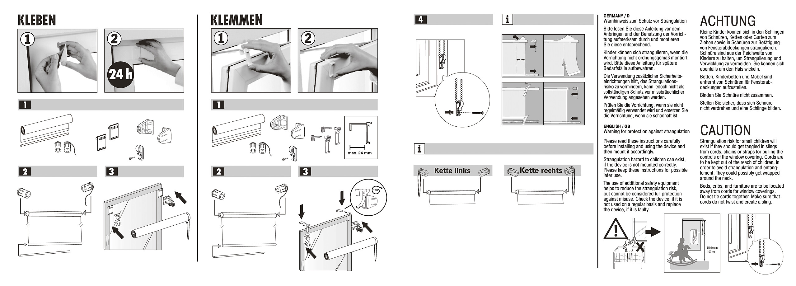 Kleben oder Klemmen für einfache Montage auf den Fensterflügel, Klemmträger verstellbar bis max. 24 mm, Schraubmontage möglich