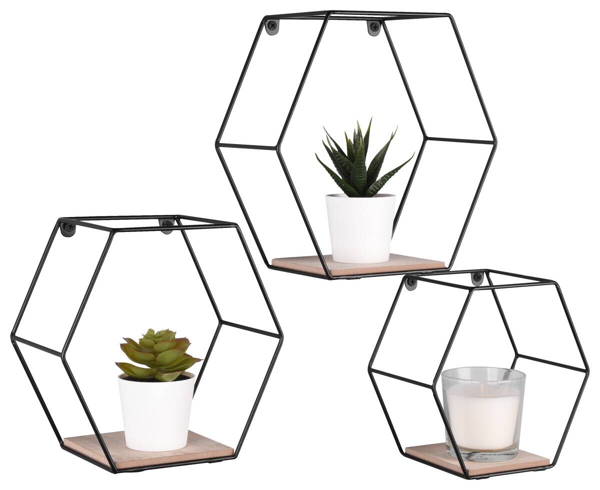 Das 3-teilige Wandregal-Set Sarah bietet mit seiner markanten Wabenform in kombination mit einem leichten Metallgestell und seiner natürlichen Holzoptik einen modernen Industrial-Look mit wohnlichem Charakter.